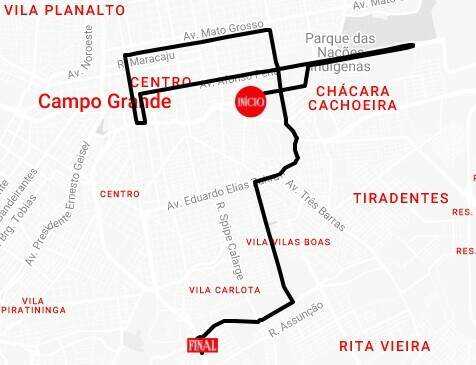 Em Campo Grande, a caravana inicia seu percurso no Comper Itanhangá, na Avenida Ricardo Brandão. Em seguida, segue pela Avenida Arquiteto Rubens Gil de Camilo e entra na Avenida Afonso Pena, passando pelo Bioparque Pantanal.