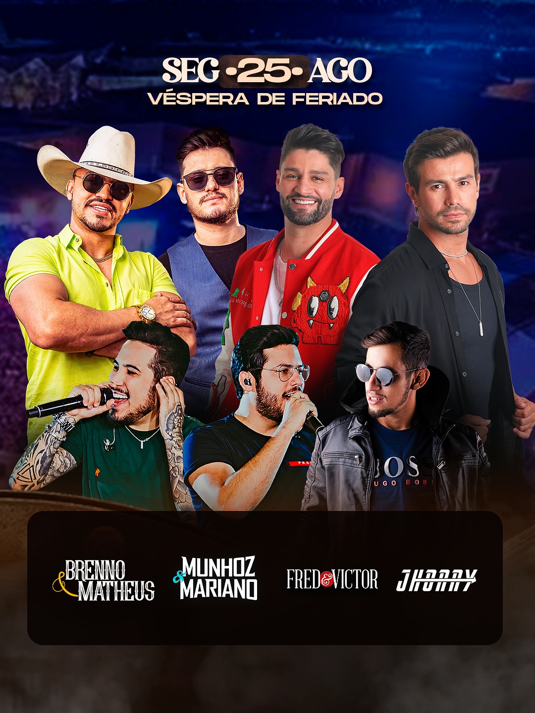 - Segunda-feira (25/08) – Véspera de feriado, a noite mais aguardada terá Fred & Victor, Munhoz & Mariano e a estreia em Campo Grande da dupla Brenno & Matheus, sucesso nacional com o hit “Descer pra BC”.