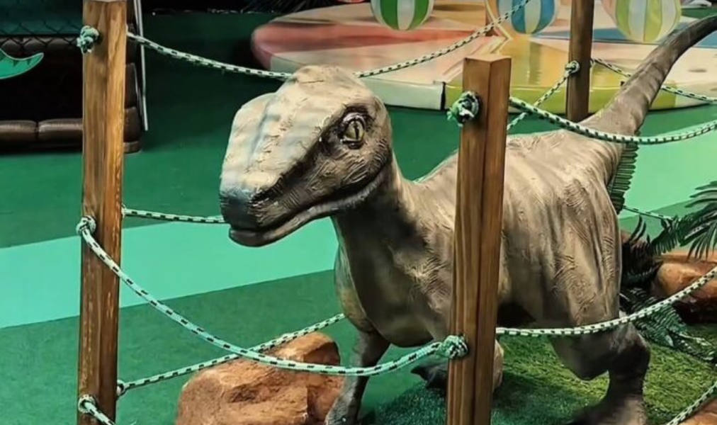 Para deixar a experiência ainda mais especial, seis réplicas de dinossauros gigantes fazem parte do cenário do parque. Além de renderem fotos incríveis, três deles são interativos e permitem que as crianças subam e passeiem pelo espaço.